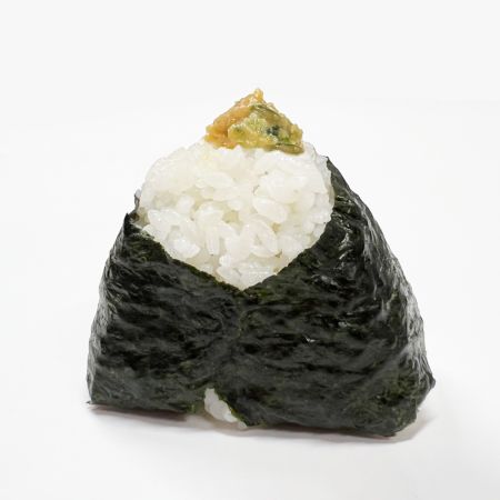 天城山系の賜物であるわさびは、伊豆市内に14カ所の産地があり全国トップクラスの産地形成を誇ります。そのわさびを肉厚の茎わかめの食感と一緒に、爽やかな辛味を楽しんでいただけるように工夫して、おむすびの具材にしています。