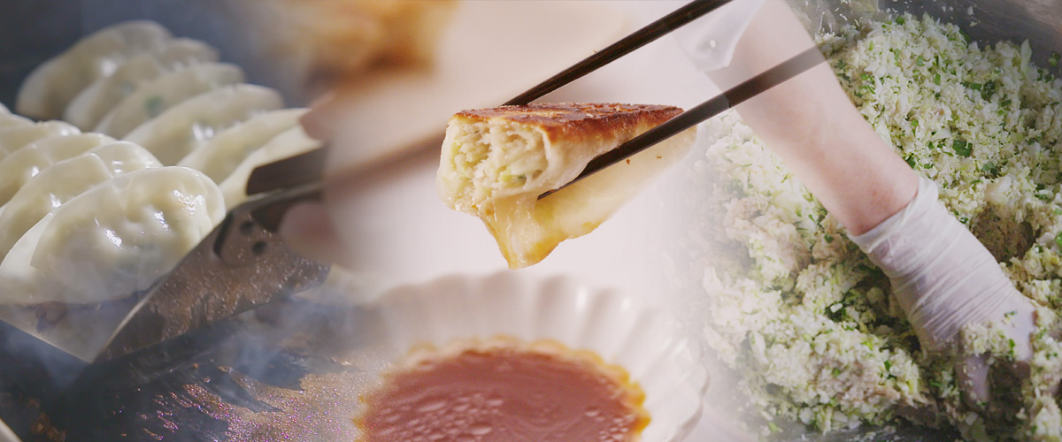 焼き面は黄金色、蒸し面にはうっすら透明感があり、食べればパリモチの食感。餡と同じく鮮度が大事な皮。店内の工房で毎日丁寧にひとつひとつ包んでいます。