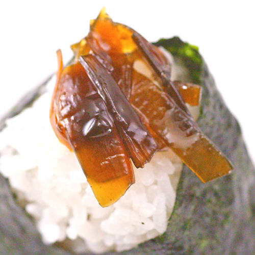 天城山系の賜物であるわさびは、伊豆市内に14カ所の産地があり全国トップクラスの産地形成を誇ります。そのわさびを肉厚の茎わかめの食感と一緒に、爽やかな辛味を楽しんでいただけるように工夫して、おむすびの具材にしています。